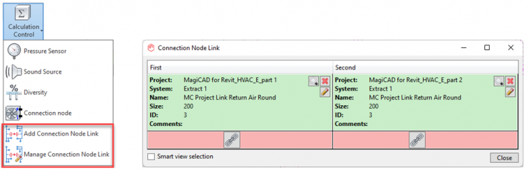 Connection nodes between models allow you to link systems in separate model files for calculation purposes. There are two methods for adding the connection nodes. In manual linking you can select the system segments that you want to link in each file. In automatic linking, a linked node is automatically imported into the same location in the corresponding model, and you can continue drawing the system from it.