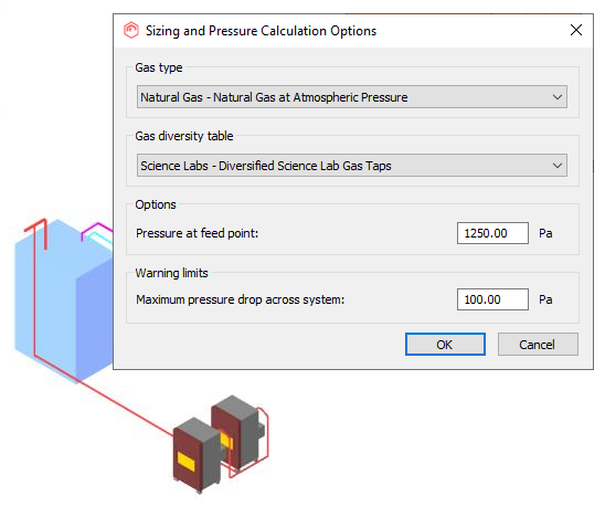 Users can define a power and design pressure level for gas outlets, a gas type and a pressure level at the network inlet. The gas calculation then performs network sizing based on the values to ensure required pressure levels at the gas outlets. There is also an optional flow diversity setting for controlling the dimensioning flow in the network.