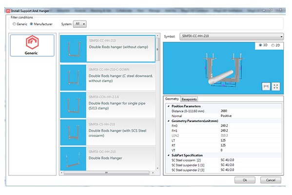 MagiCAD provides a library of both standard and manufacturer support and hanger components. The available support and hanger products can be filtered by system type, bracing subpart, root, and subpart replacement. This enables you to easily find a suitable solution for each situation.