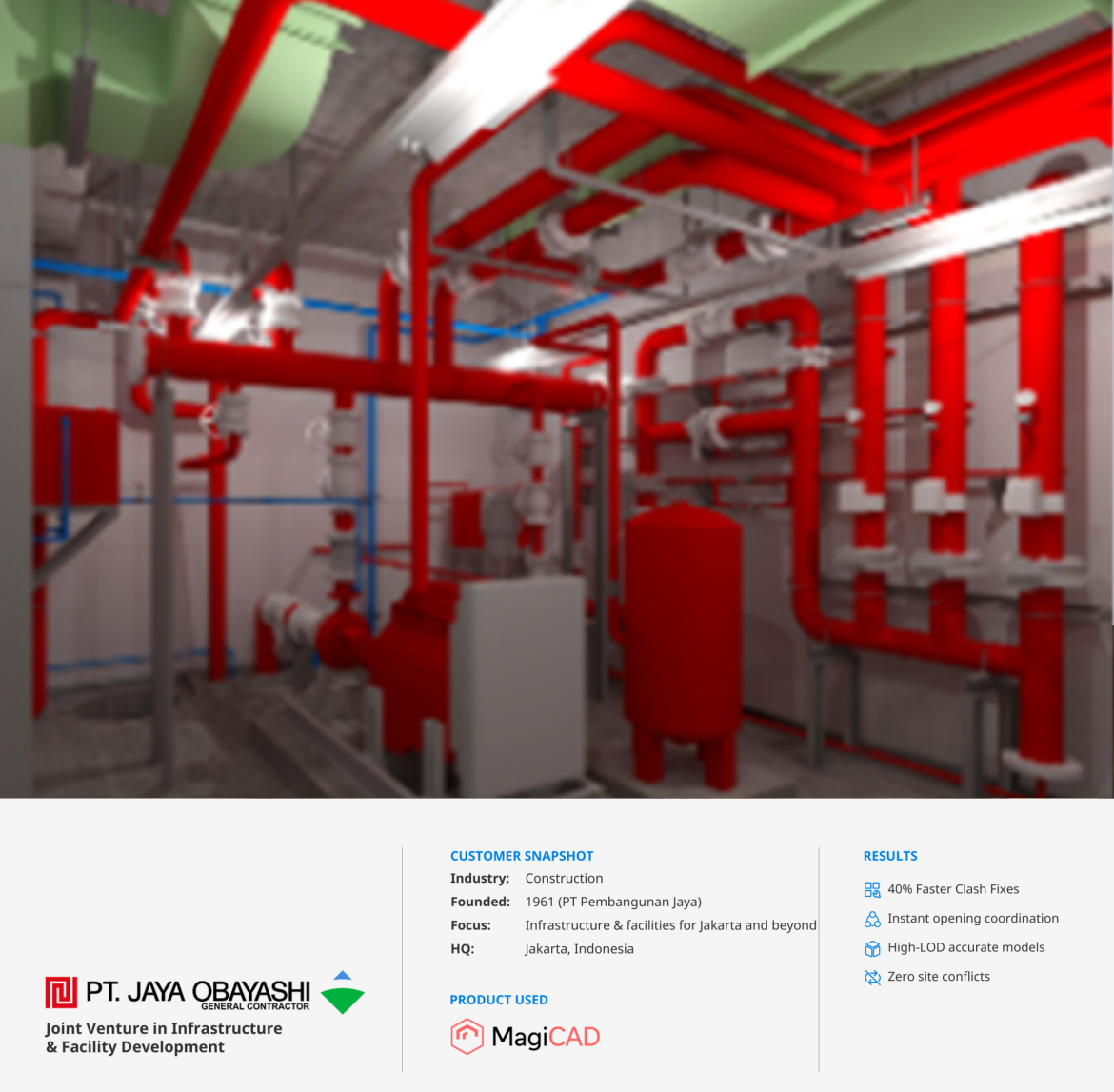 How do you deliver efficient MEP BIM workflows in a tight urban site with limited road access, complex coordination demands, and strict quality standards? In one of Jakarta’s most constrained urban sites, PT Jaya Obayashi faced complex mechanical, electrical, and plumbing (MEP) coordination challenges during the extension of its Jakarta office. With limited road access, multiple trade disciplines, and strict requirements for high-LOD (Level of Detail) BIM models, the project demanded innovation beyond traditional workflows. By implementing MagiCAD BIM solutions for Revit, the team achieved 40% faster clash resolution, automated opening management, and manufacturer-specific content integration—delivering measurable results that set a new benchmark for BIM adoption in Indonesian construction projects.